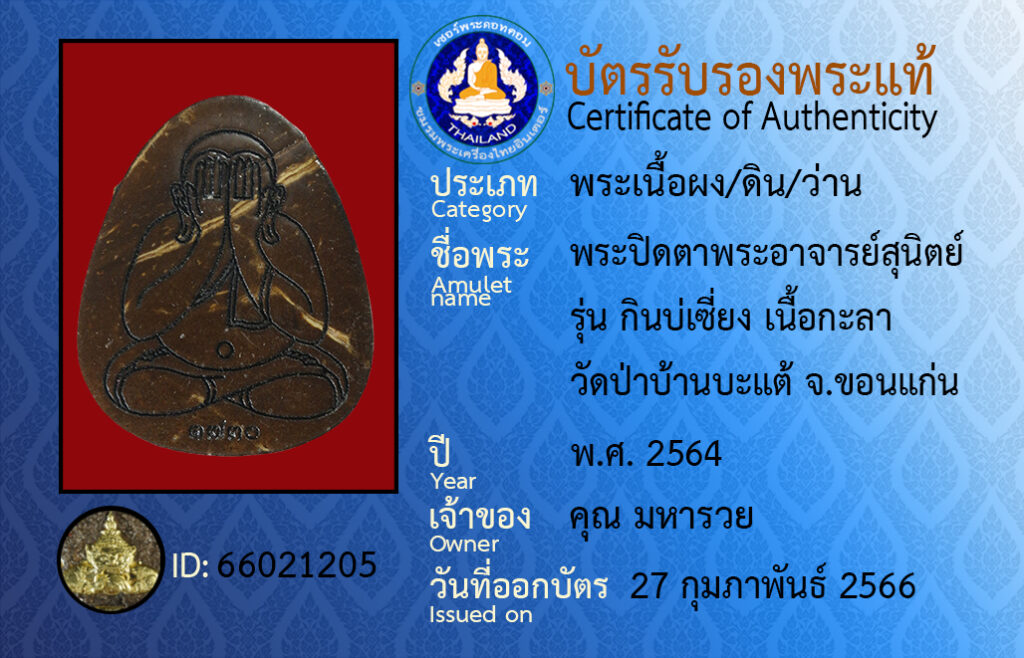 Amulet name : pra bpit dtaa pra aa jaan su nit run gin bor siang neua ka laa wat pa ban ba tae khon kaen