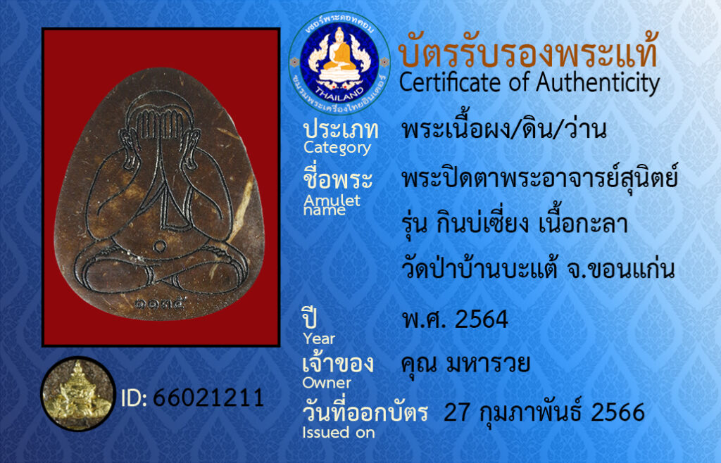 Amulet name : pra bpit dtaa pra aa jaan su nit run gin bor siang neua ka laa wat pa ban ba tae khon kaen