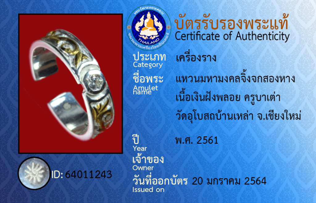 Amulet name : ring ma ha mong kon jing jok song haang koo ba dtao, wat u bo sot ban lao