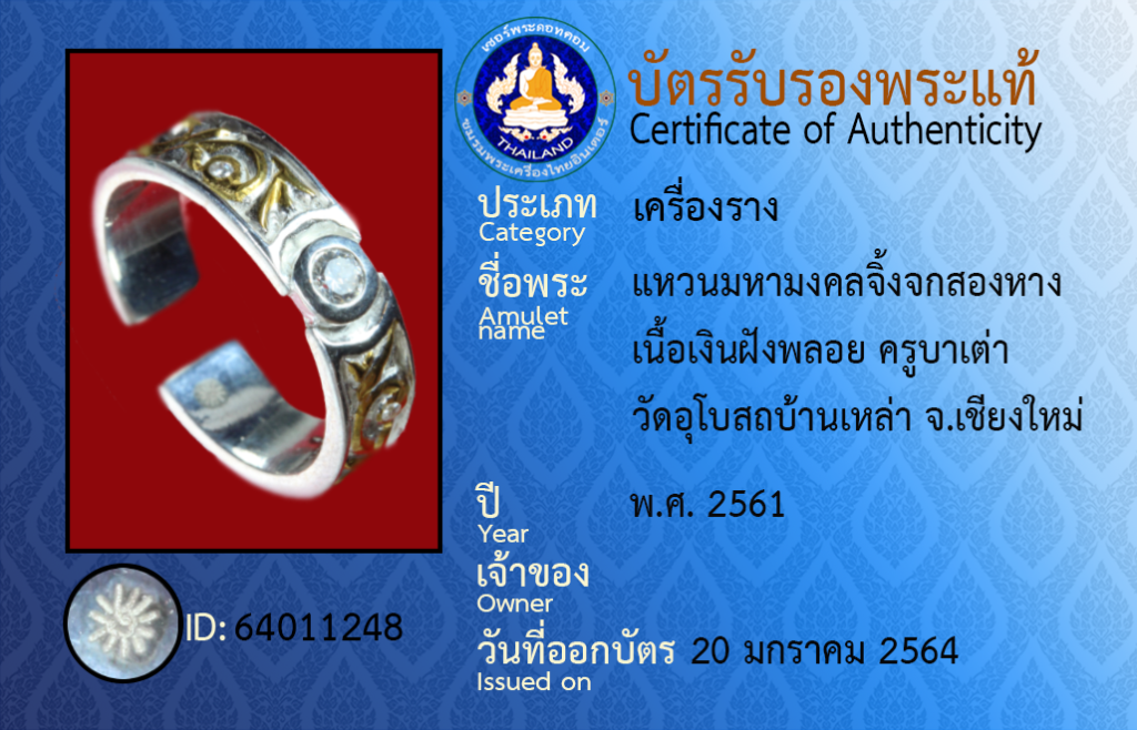 Amulet name : ring ma ha mong kon jing jok song haang koo ba dtao, wat u bo sot ban lao