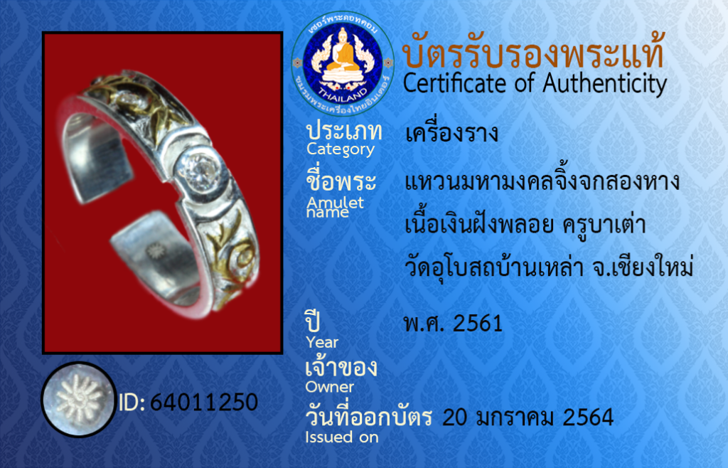Amulet name : ring ma ha mong kon jing jok song haang koo ba dtao, wat u bo sot ban lao