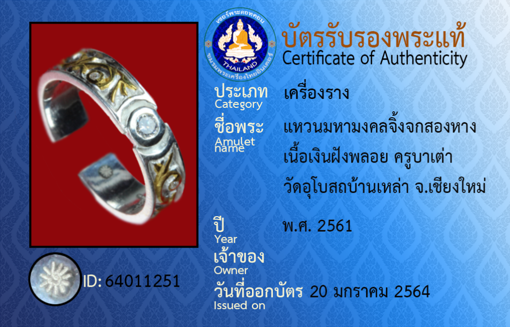 Amulet name : ring ma ha mong kon jing jok song haang koo ba dtao, wat u bo sot ban lao