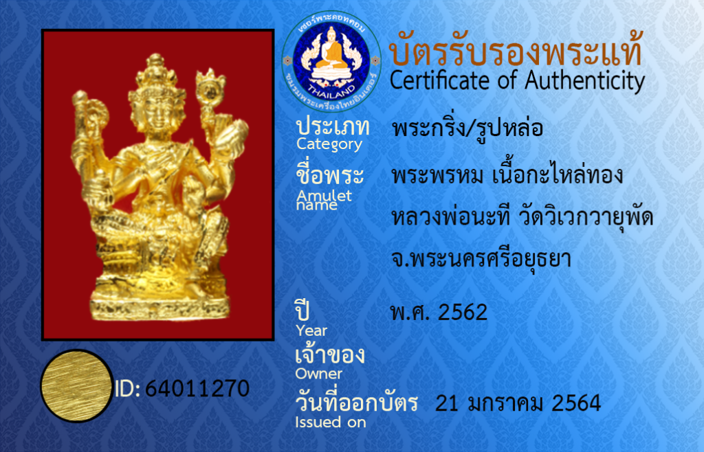 ชื่อพระ : พระพรหม เนื้อกะไหล่ทอง หลวงพ่อนะที วัดวิเวกวายุพัด จ.พระนครศรีอยุธยา