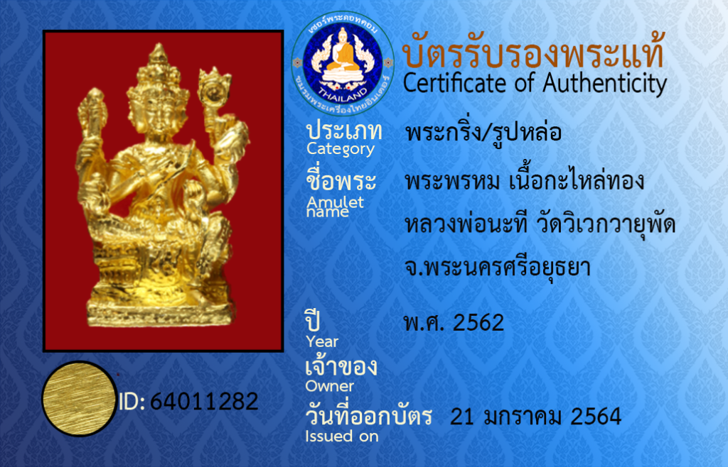 ชื่อพระ : พระพรหม เนื้อกะไหล่ทอง หลวงพ่อนะที วัดวิเวกวายุพัด จ.พระนครศรีอยุธยา