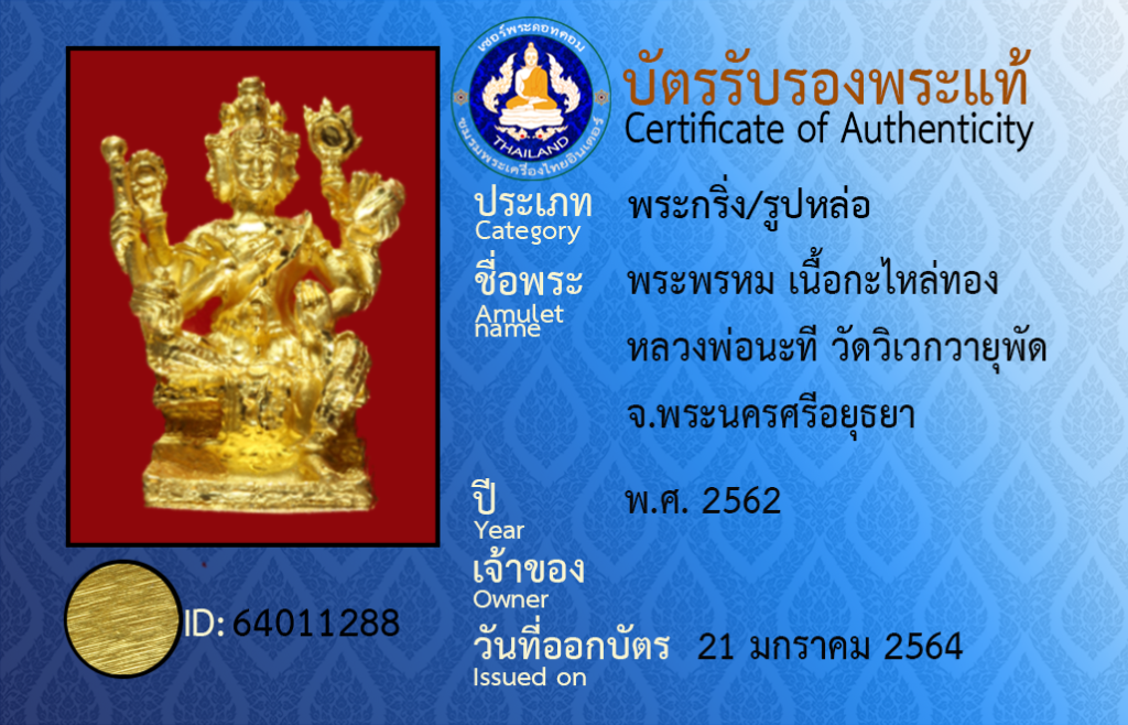 ชื่อพระ : พระพรหม เนื้อกะไหล่ทอง หลวงพ่อนะที วัดวิเวกวายุพัด จ.พระนครศรีอยุธยา