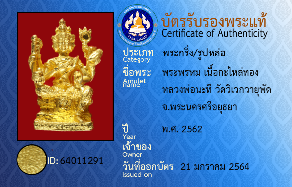 ชื่อพระ : พระพรหม เนื้อกะไหล่ทอง หลวงพ่อนะที วัดวิเวกวายุพัด จ.พระนครศรีอยุธยา