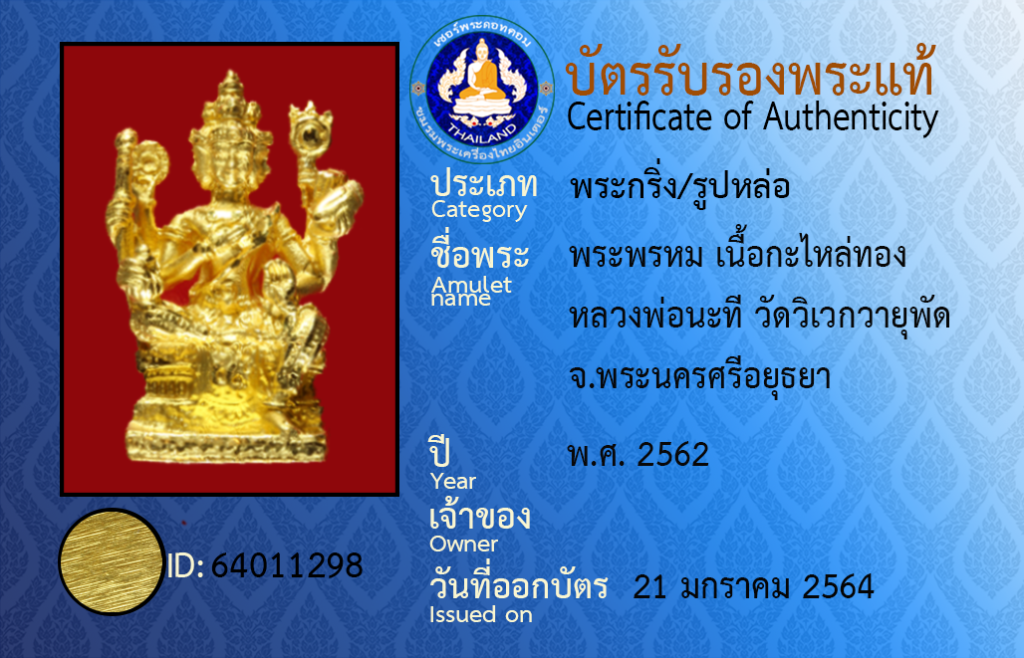 ชื่อพระ : พระพรหม เนื้อกะไหล่ทอง หลวงพ่อนะที วัดวิเวกวายุพัด จ.พระนครศรีอยุธยา