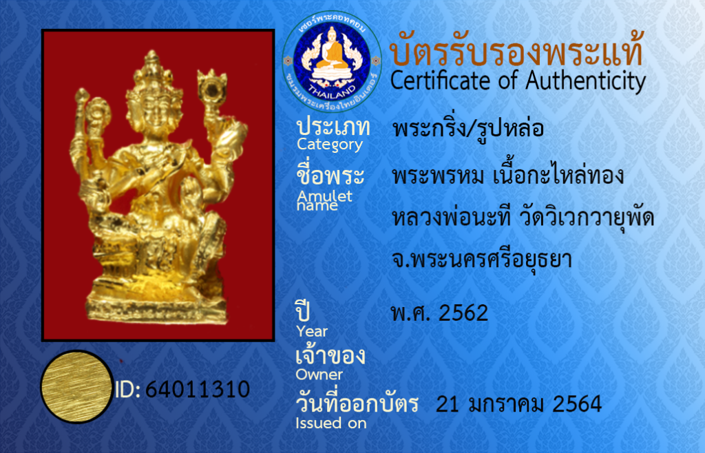 ชื่อพระ : พระพรหม เนื้อกะไหล่ทอง หลวงพ่อนะที วัดวิเวกวายุพัด จ.พระนครศรีอยุธยา