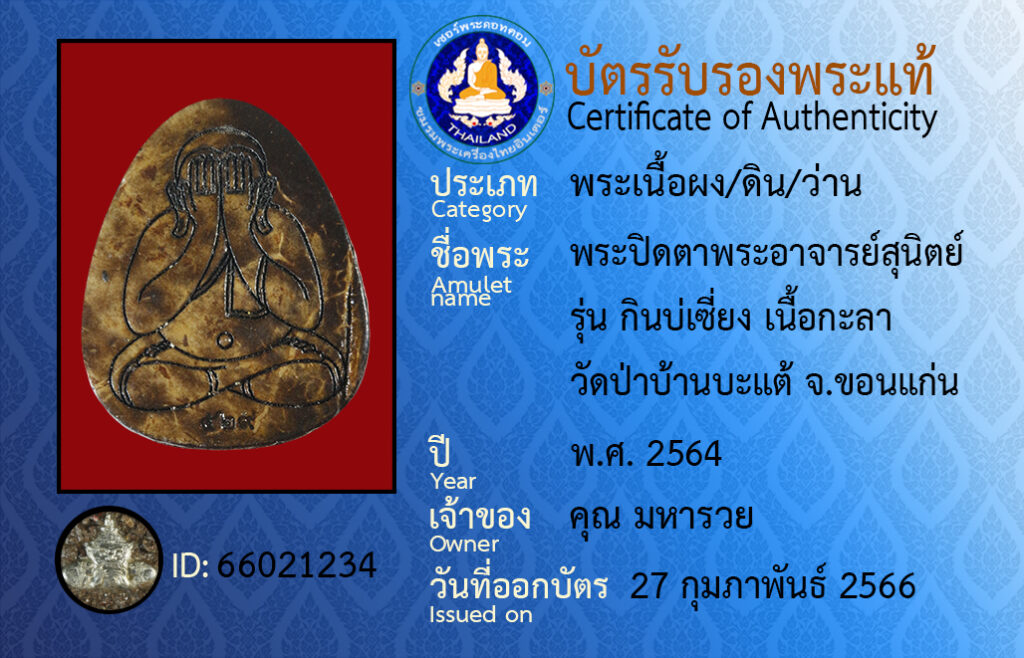 Amulet name : pra bpit dtaa pra aa jaan su nit run gin bor siang neua ka laa wat pa ban ba tae khon kaen