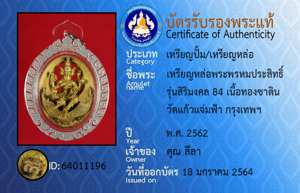 ชื่อพระ : เหรียญหล่อพระพรหมประสิทธิ์ รุ่นสิริมงคล 84 เนื้อทองซาติน วัดแก้วแจ่มฟ้า กรุงเทพฯ