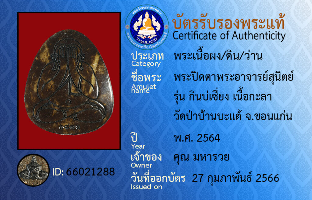 Amulet name : pra bpit dtaa pra aa jaan su nit run gin bor siang neua ka laa wat pa ban ba tae khon kaen