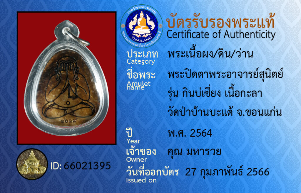Amulet name : pra bpit dtaa pra aa jaan su nit run gin bor siang neua ka laa wat pa ban ba tae khon kaen