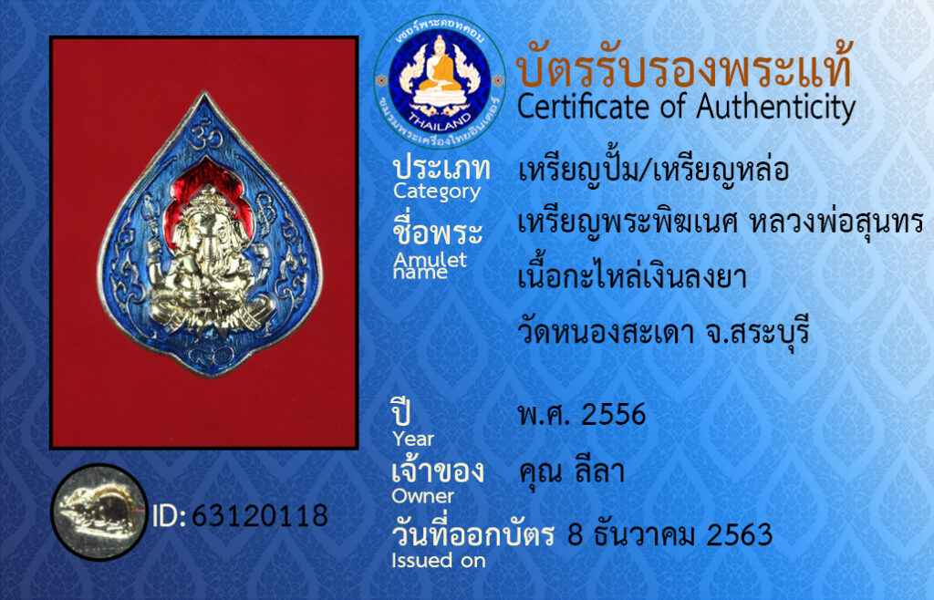 ชื่อพระ : เหรียญพระพิฆเนศ หลวงพ่อสุนทร เนื้อกะไหล่เงินลงยา วัดหนองสะเดา จ.สระบุรี