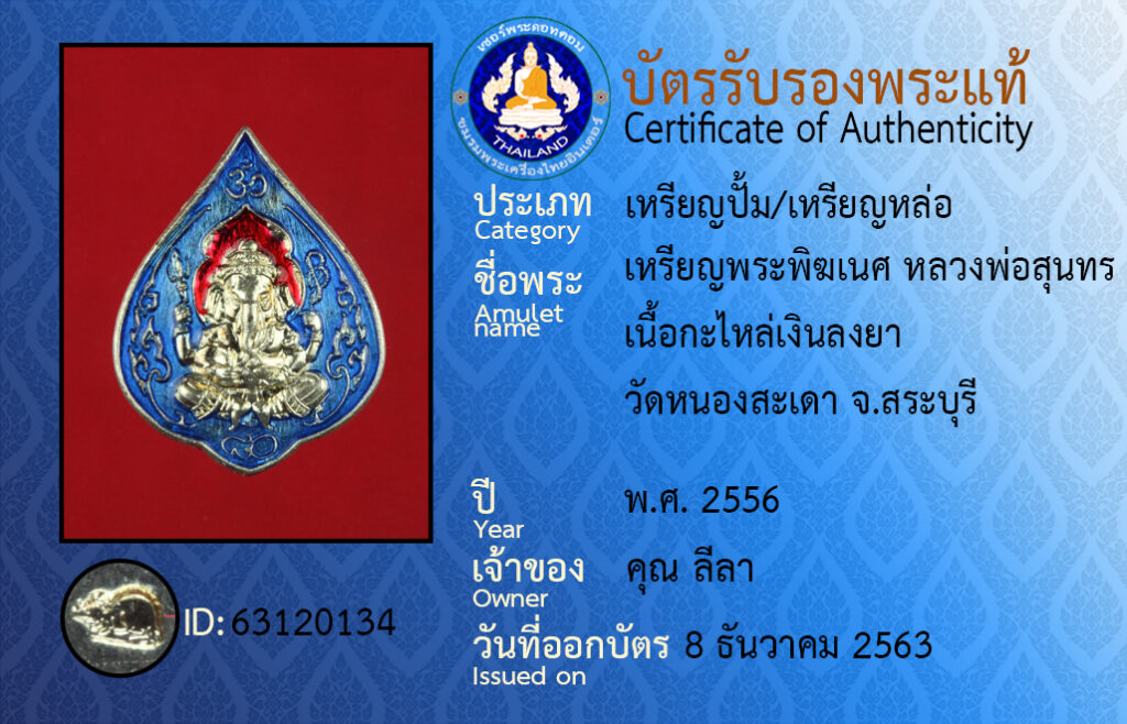 ชื่อพระ : เหรียญพระพิฆเนศ หลวงพ่อสุนทร เนื้อกะไหล่เงินลงยา วัดหนองสะเดา จ.สระบุรี
