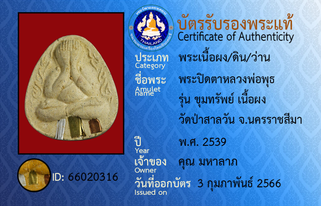 Amulet name :Phra pid ta luang por put run kum sap neua pong watpasalawan nakonratseema