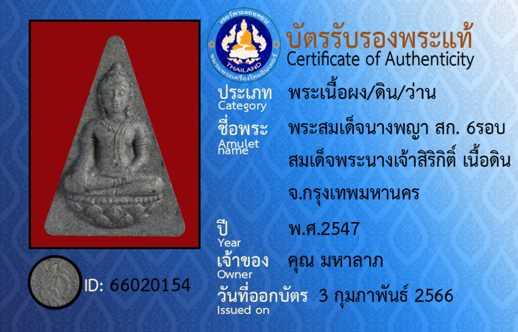 ชื่อพระ : พระสมเด็จนางพญา สก. 6 รอบ สมเด็จพระนางเจ้าสิริกิติ์ เนื้อดิน จ.กรุงเทพมหานคร