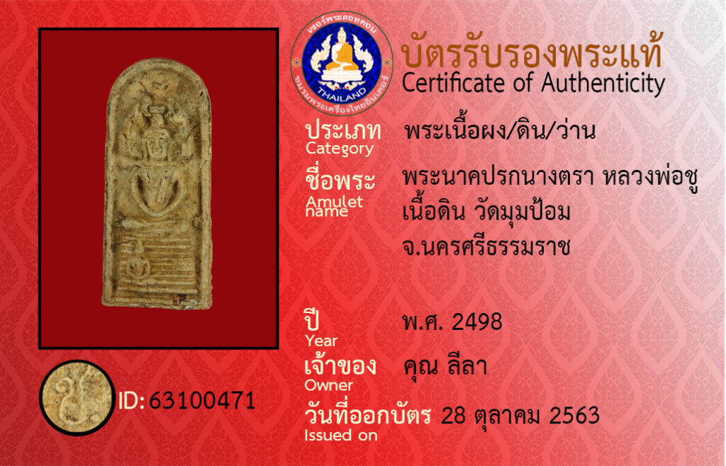ชื่อพระ : พระนาคปรกนางตรา หลวงพ่อชู เนื้อดิน วัดมุมป้อม จ.นครศรีธรรมราช