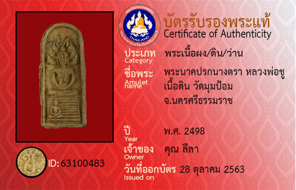 ชื่อพระ : พระนาคปรกนางตรา หลวงพ่อชู เนื้อดิน วัดมุมป้อม จ.นครศรีธรรมราช