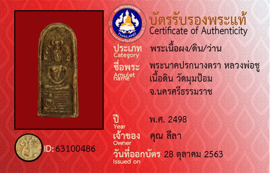 ชื่อพระ : พระนาคปรกนางตรา หลวงพ่อชู เนื้อดิน วัดมุมป้อม จ.นครศรีธรรมราช