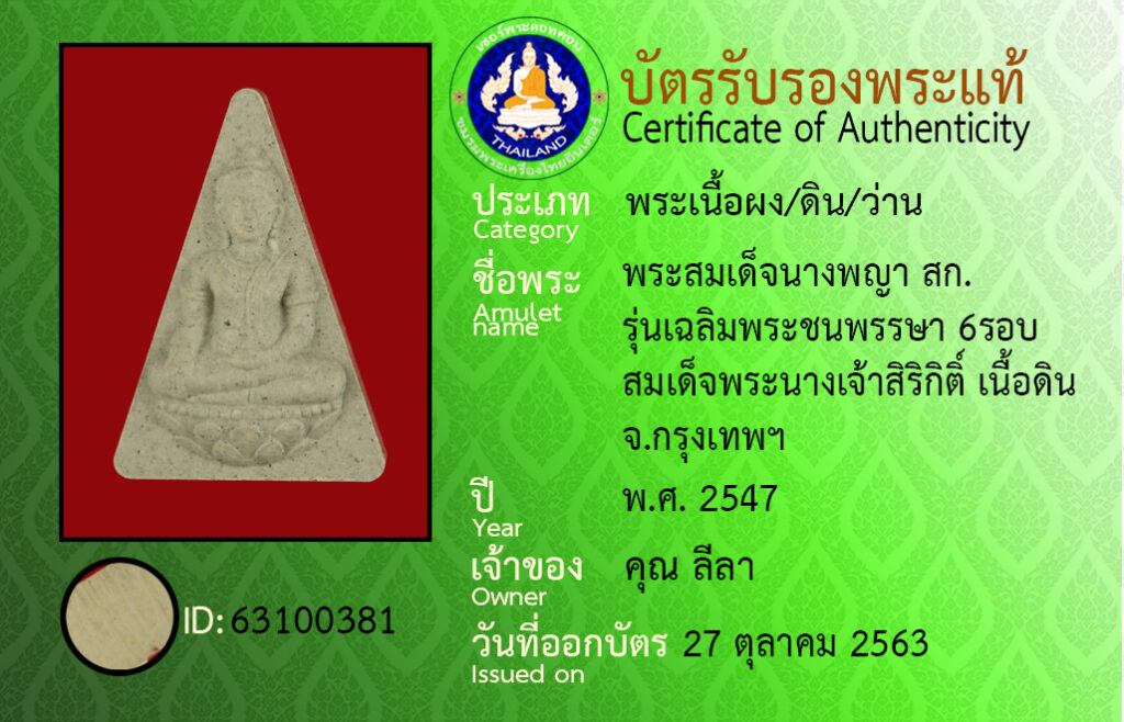 佛牌名称 : 诗丽吉皇太后七十二岁 南帕亚 圣粉材质 泰国曼谷 佛历2547年