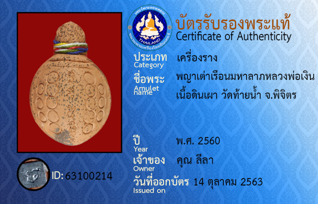 ชื่อพระ : พญาเต่าเรือนมหาลาภหลวงพ่อเงินเนื้อดินเผา วัดท้ายน้ำ จ.พิจิตร