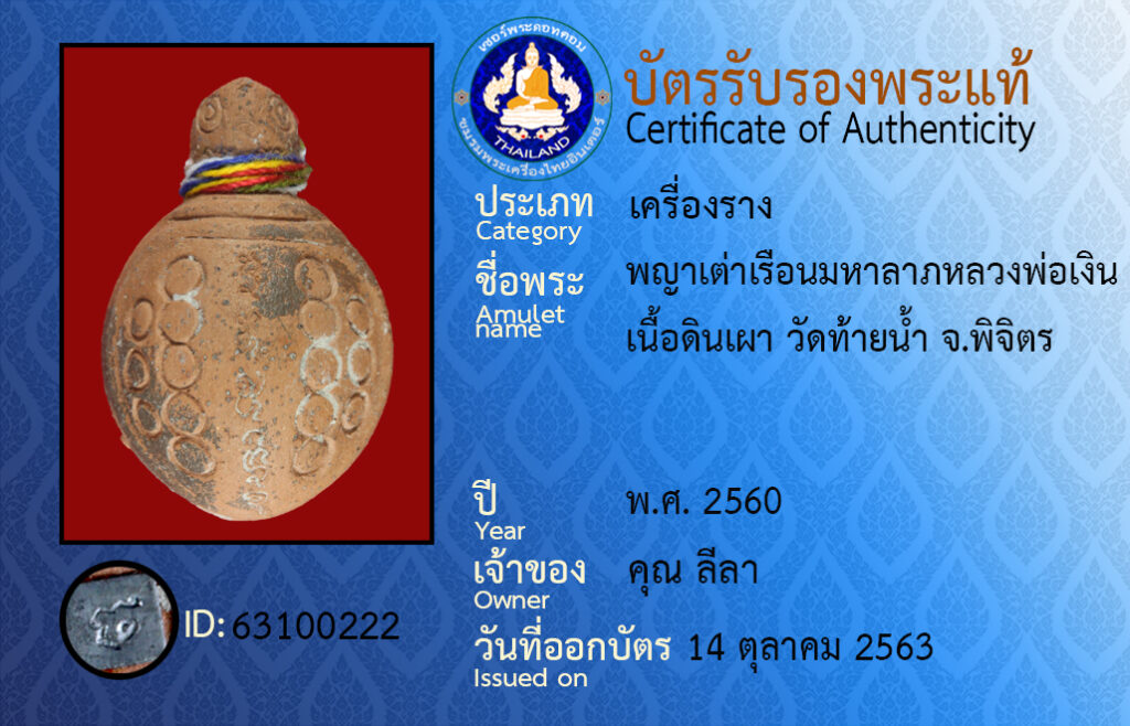 ชื่อพระ : พญาเต่าเรือนมหาลาภหลวงพ่อเงินเนื้อดินเผา วัดท้ายน้ำ จ.พิจิตร