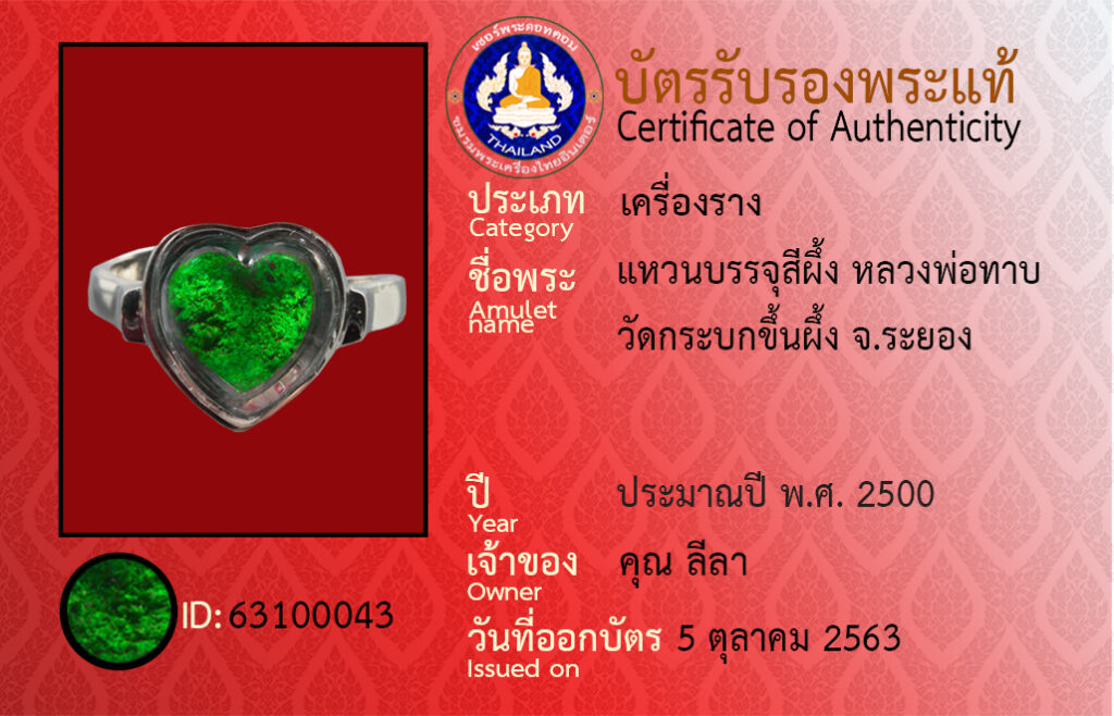 ชื่อพระ : แหวนบรรจุสีผึ้ง หลวงพ่อทาบ วัดกระบกขึ้นผึ้ง จ.ระยอง