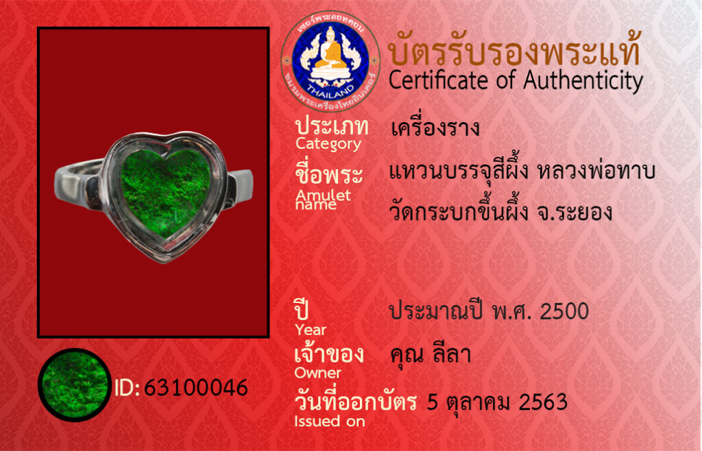 ชื่อพระ : แหวนบรรจุสีผึ้ง หลวงพ่อทาบ วัดกระบกขึ้นผึ้ง จ.ระยอง
