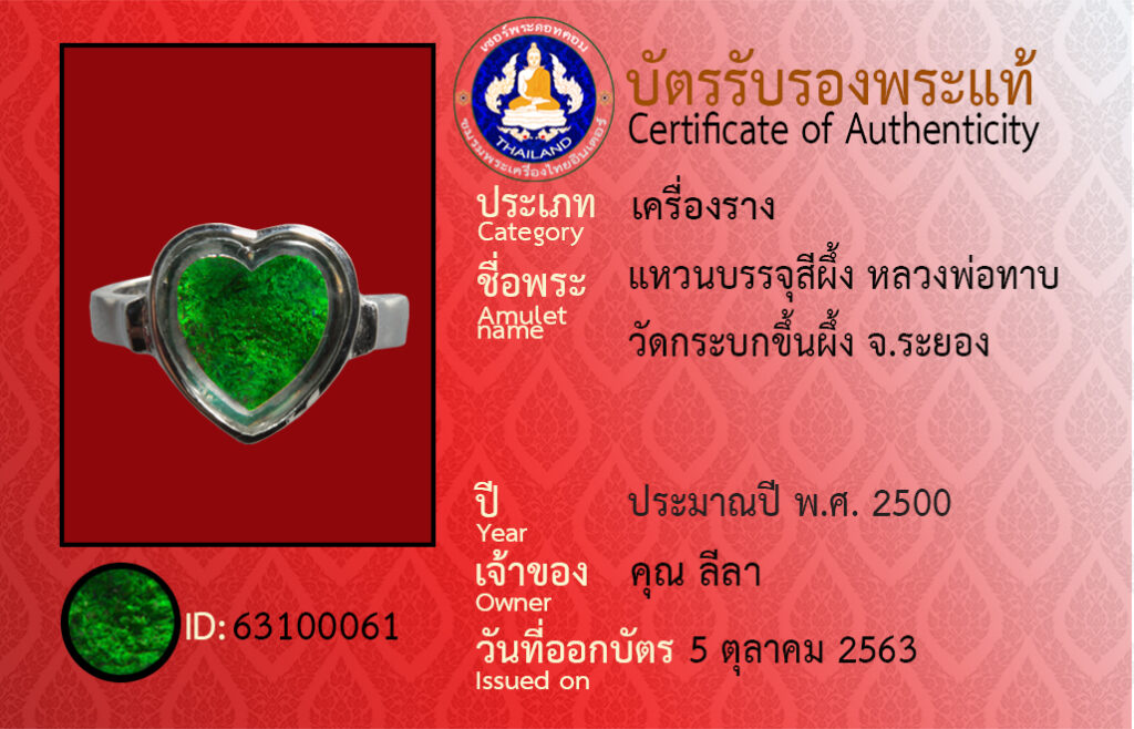 ชื่อพระ : แหวนบรรจุสีผึ้ง หลวงพ่อทาบ วัดกระบกขึ้นผึ้ง จ.ระยอง