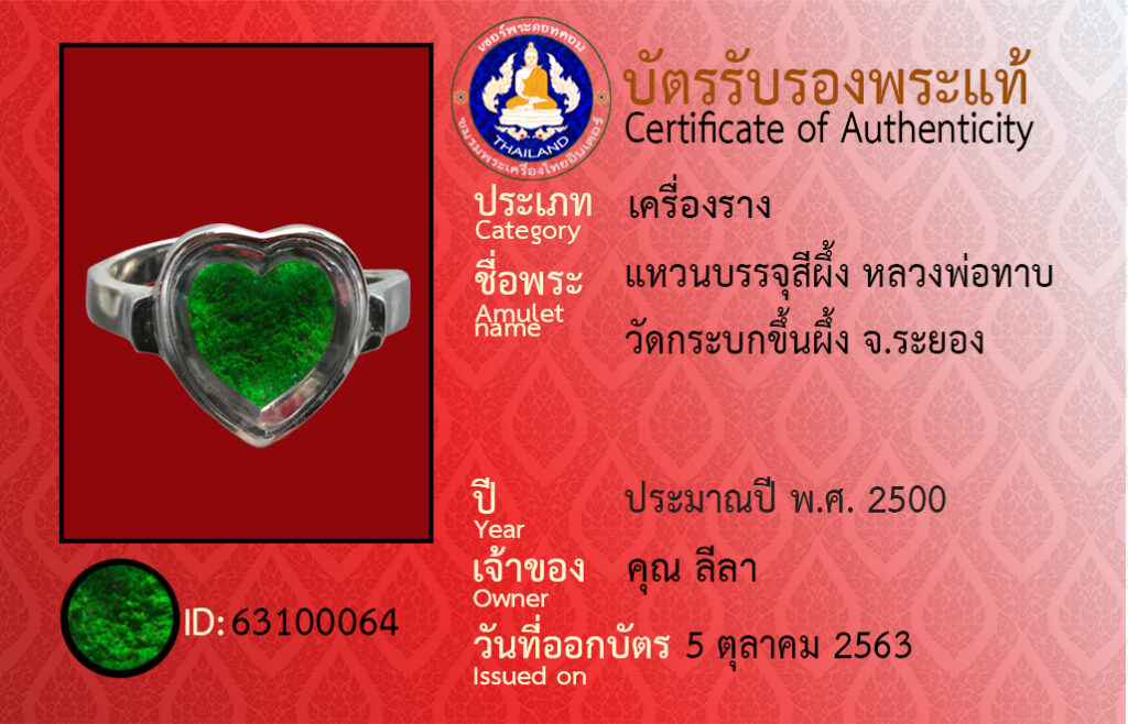 ชื่อพระ : แหวนบรรจุสีผึ้ง หลวงพ่อทาบ วัดกระบกขึ้นผึ้ง จ.ระยอง
