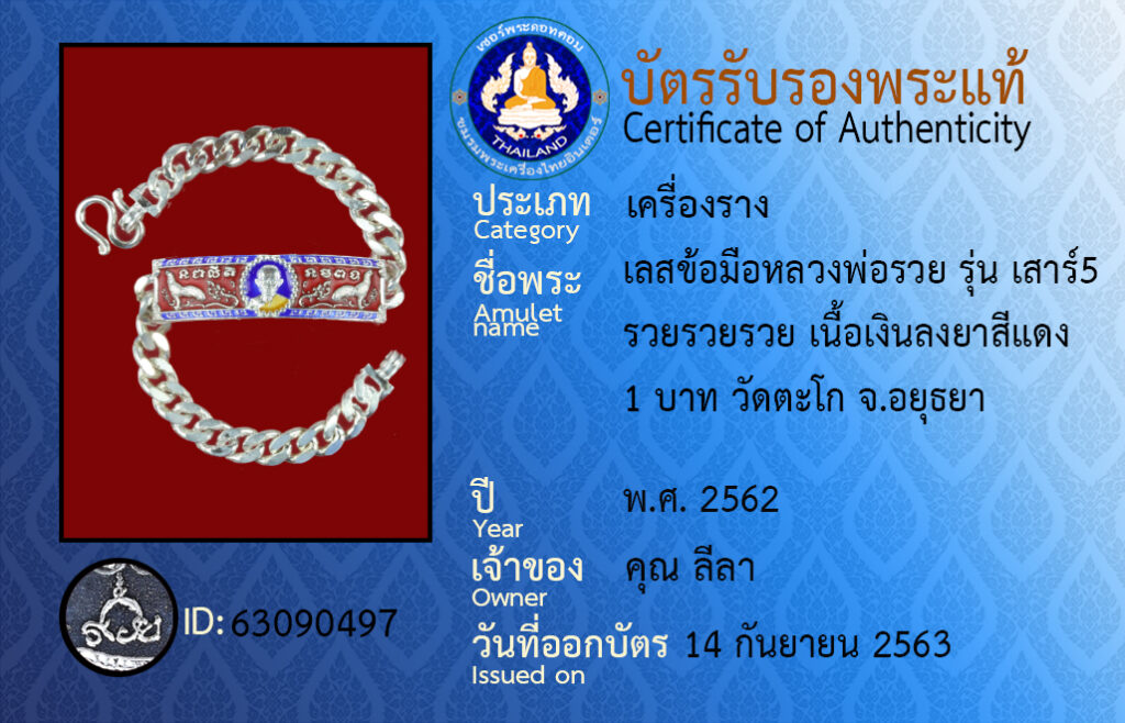 ชื่อพระ : เลสข้อมือหลวงพ่อรวย รุ่น เสาร์5 รวยรวยรวย เนื้อเงินลงยาสีเเดง 1 บาท วัดตะโก จ.อยุธยา