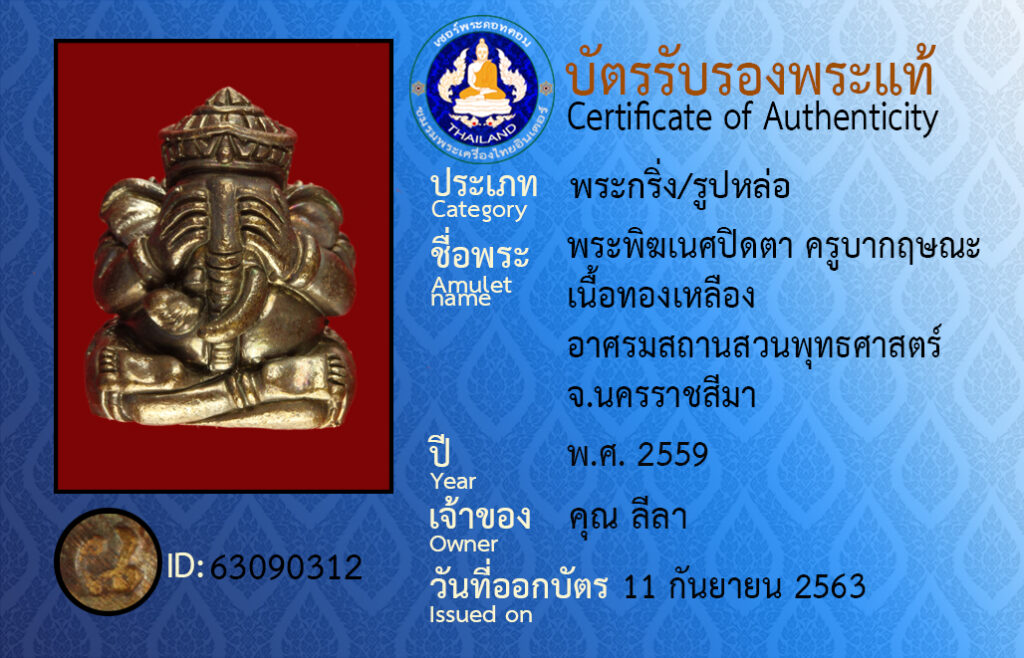ชื่อพระ : พระพิฆเนศปิดตา ครูบากฤษณะ เนื้อทองเหลือง อาศรมสถานสวนพุทธศาสตร์ จ.นครราชสีมา
