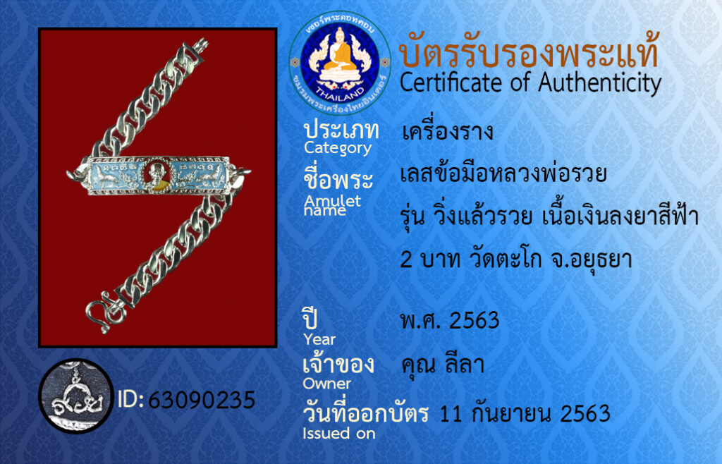 ชื่อพระ : เลสข้อมือหลวงพ่อรวย รุ่น วิ่งแล้วรวย เนื้อเงินลงยาสีฟ้า2 บาท วัดตะโก จ.อยุธยา