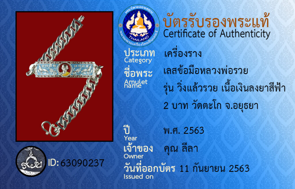 ชื่อพระ : เลสข้อมือหลวงพ่อรวย รุ่น วิ่งแล้วรวย เนื้อเงินลงยาสีฟ้า2 บาท วัดตะโก จ.อยุธยา