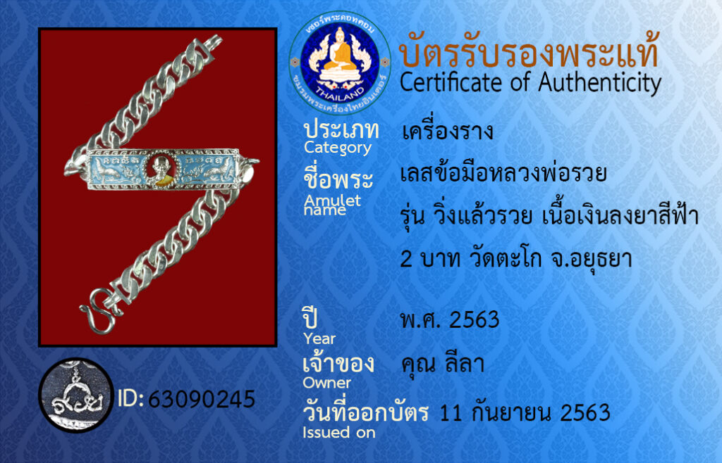 ชื่อพระ : เลสข้อมือหลวงพ่อรวย รุ่น วิ่งแล้วรวย เนื้อเงินลงยาสีฟ้า2 บาท วัดตะโก จ.อยุธยา