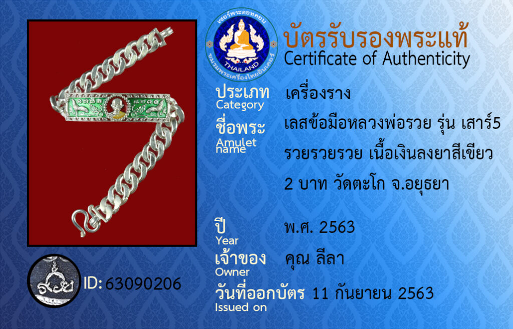ชื่อพระ : เลสข้อมือหลวงพ่อรวย รุ่น เสาร์5 รวยรวยรวย เนื้อเงินลงยาสีเขียว 2 บาท วัดตะโก จ.อยุธยา