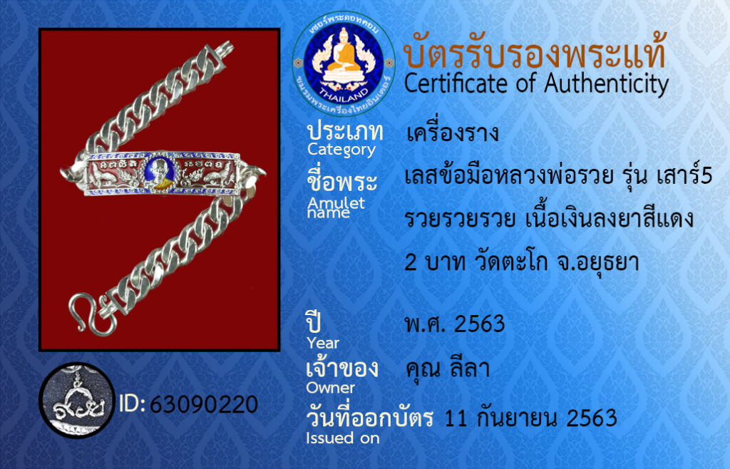 ชื่อพระ : เลสข้อมือหลวงพ่อรวย รุ่น เสาร์5 รวยรวยรวย เนื้อเงินลงยาสีแดง 2 บาท วัดตะโก จ.อยุธยา