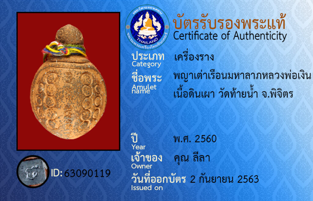 Amulet name : pra ya dtao reuan ma ha lap luang por ngern , wat tai nam
