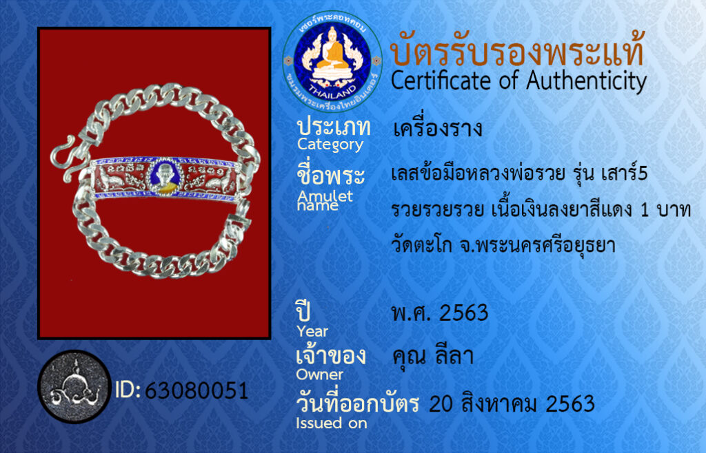 ชื่อพระ : เลสข้อมือหลวงพ่อรวย รุ่น เสาร์5 รวยรวยรวย เนื้อเงินลงยาสีแดง1 บาท วัดตะโก จ.อยุธยา