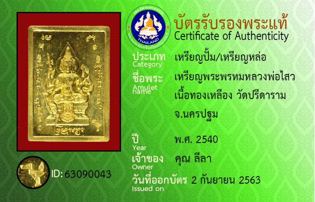 ชื่อพระ : เหรียญพระพรหมหลวงพ่อไสว เนื้อทองเหลือง วัดปรีดาราม จ.นครปฐม