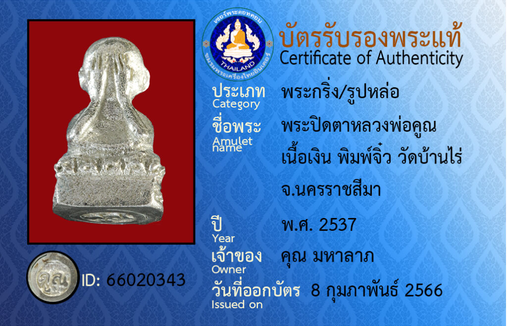 Amulet name :Phra pid ta luang por koon neua ngern pim jiw wat ban rai na kon rat see ma