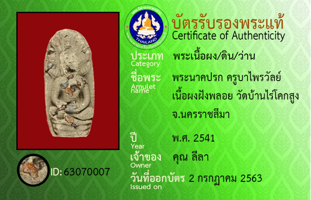 ชื่อพระ : พระนาคปรก ครูบาไพรวัลย์ เนื้อผงฝังพลอย วัดบ้านไร่โคกสูง จ.นครราชสีมา