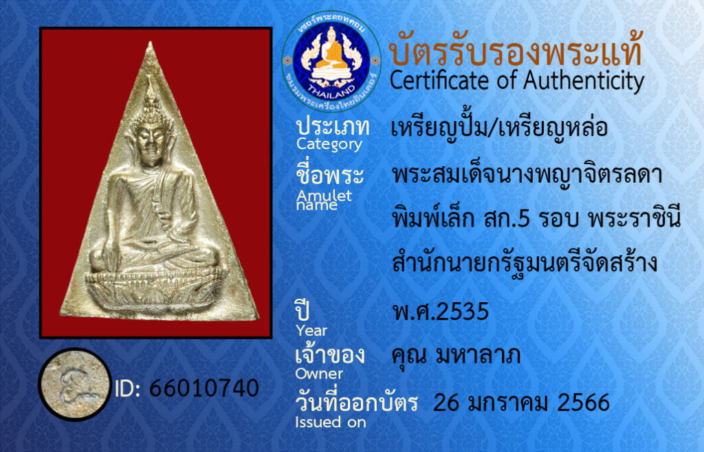 ชื่อพระ : พระสมเด็จนางพญาจิตรลดา พิมพ์ใหญ่ สก.5 รอบ พระราชินี สำนักนายกรัฐมนตรีจัดสร้าง