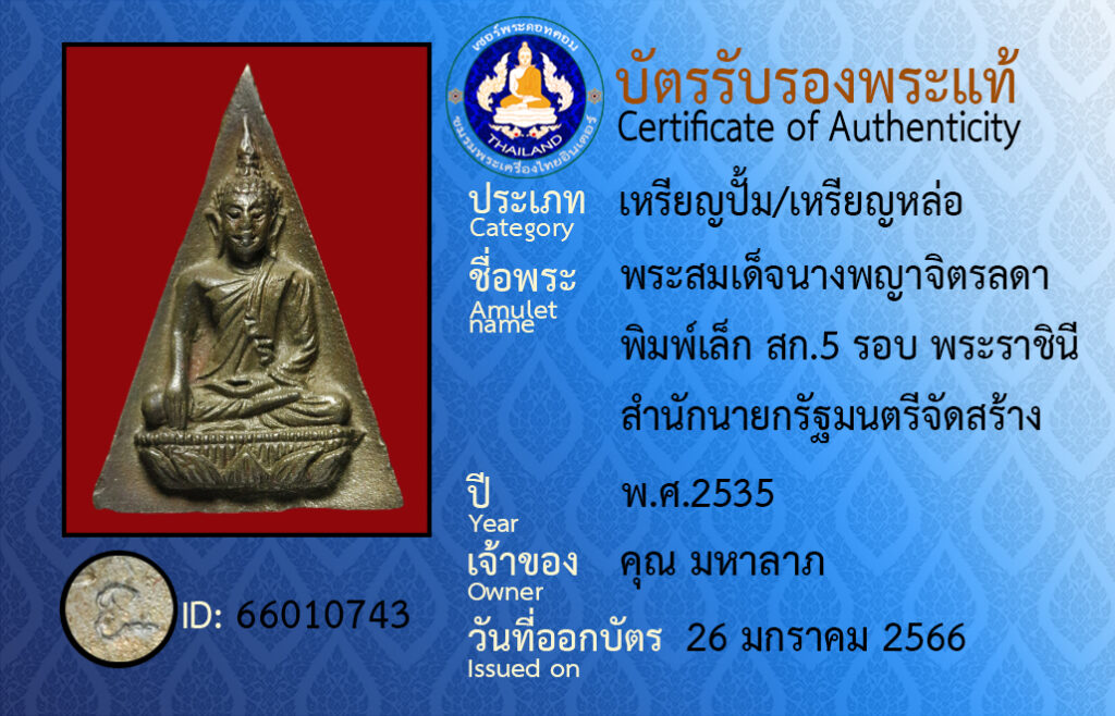 ชื่อพระ : พระสมเด็จนางพญาจิตรลดา พิมพ์ใหญ่ สก.5 รอบ พระราชินี สำนักนายกรัฐมนตรีจัดสร้าง