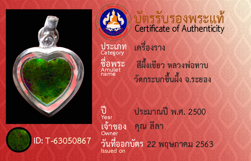 ชื่อพระ : สีผึ้งเขียว หลวงพ่อทาบ วัดกระบกขึ้นผึ้ง จ.ระยอง
