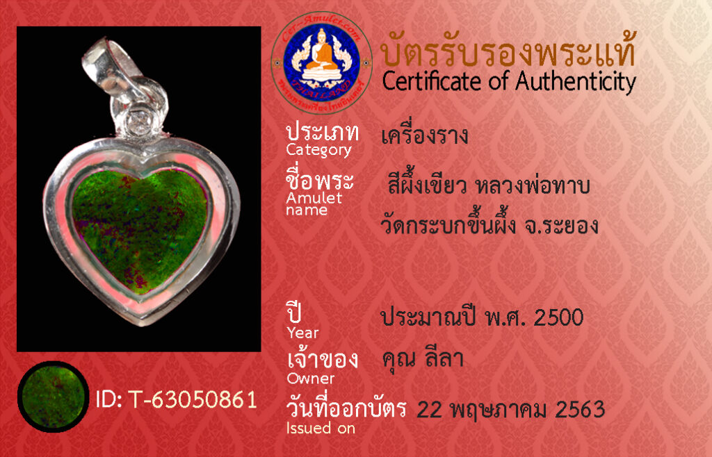 ชื่อพระ : สีผึ้งเขียว หลวงพ่อทาบ วัดกระบกขึ้นผึ้ง จ.ระยอง
