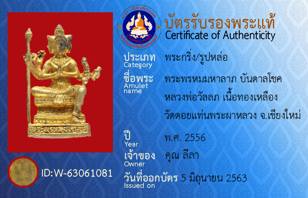ชื่อพระ : พระพรหมมหาลาภ บันดาลโชค หลวงพ่อวัลลภ เนื้อทองเหลือง วัดดอยแท่นพระผาหลวง จ.เชียงใหม่