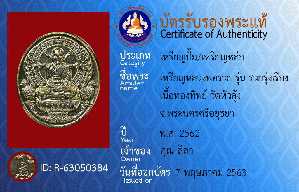 ชื่อพระ : เหรียญหลวงพ่อรวย รุ่น รวยรุ่งเรือง เนื้อทองทิพย์ วัดหัวคุ้ง จ.พระนครศรีอยุธยา