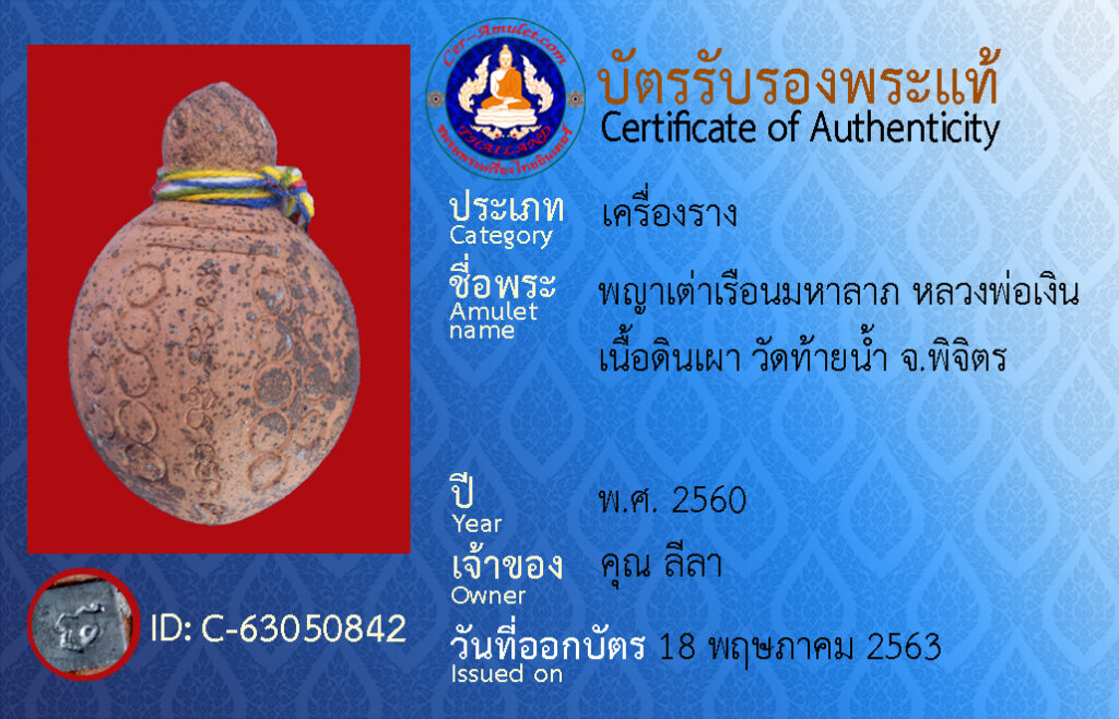 ชื่อพระ : พญาเต่าเรือนมหาลาภ หลวงพ่อเงิน เนื้อดินเผา วัดท้ายน้ำ จ.พิจิตร