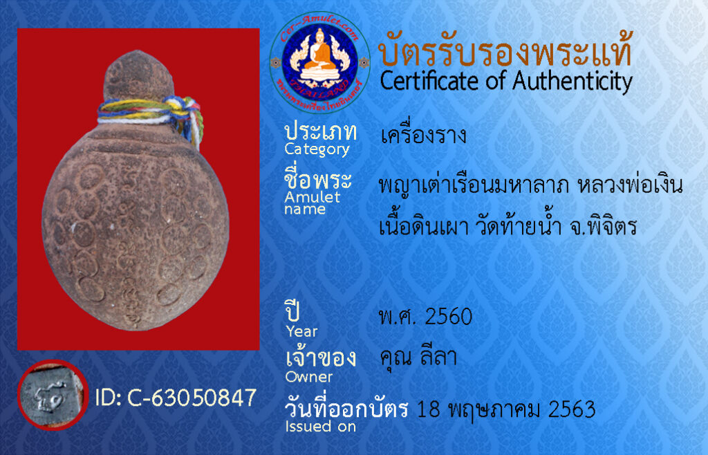 ชื่อพระ : พญาเต่าเรือนมหาลาภ หลวงพ่อเงิน เนื้อดินเผา วัดท้ายน้ำ จ.พิจิตร